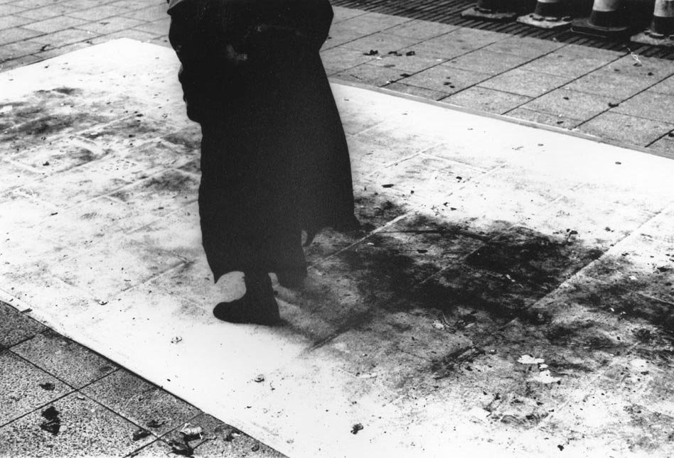 Binnen 3 Stunden war alles fertig. Auf dem Dach des Einkaufszentrums gegenüber wurde eine Videokamera installiert, um festzuhalten was ab jetzt da unten auf der Kunstbaustelle geschehen sollte. (Video, Happening, Building Site). innerhalb der folgenden 3 Tagen und Nächte sollten 20 000 Menschen über die Leinwand laufen (Trespass).